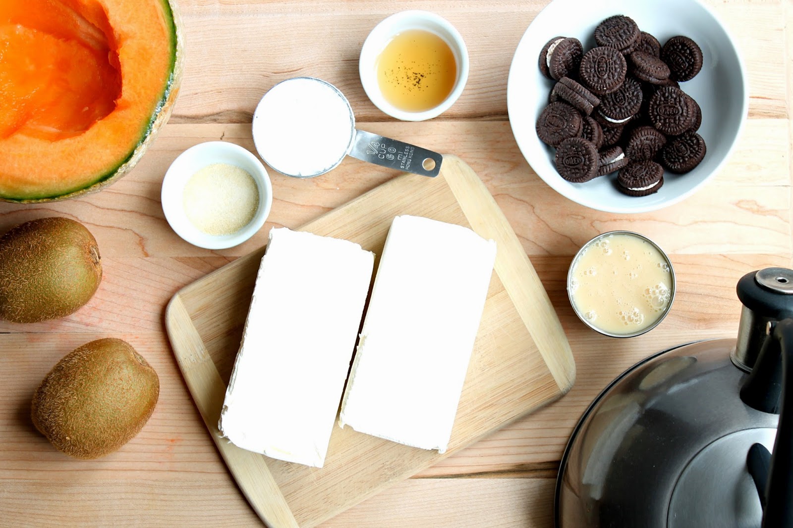 Cantaloupe Cheesecake Cantaloupe Cheesecake : Graham crackers, sugar, unsalted butter, gelatin powder, water, cream cheese, sugar, heavy whipping cream.