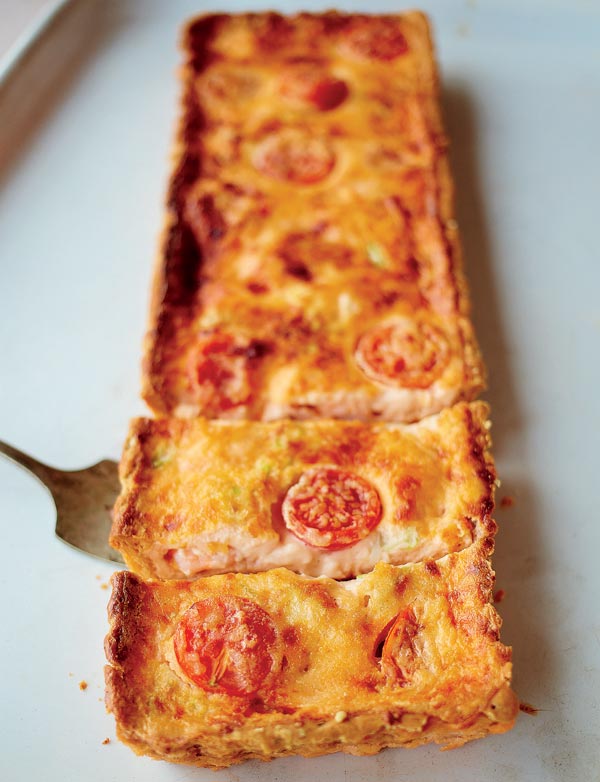 Salmon And Prawn Quiche Salmon And Prawn Quiche : Fresh salmon, eggs, pastry, cream, salt, dill, pepper.