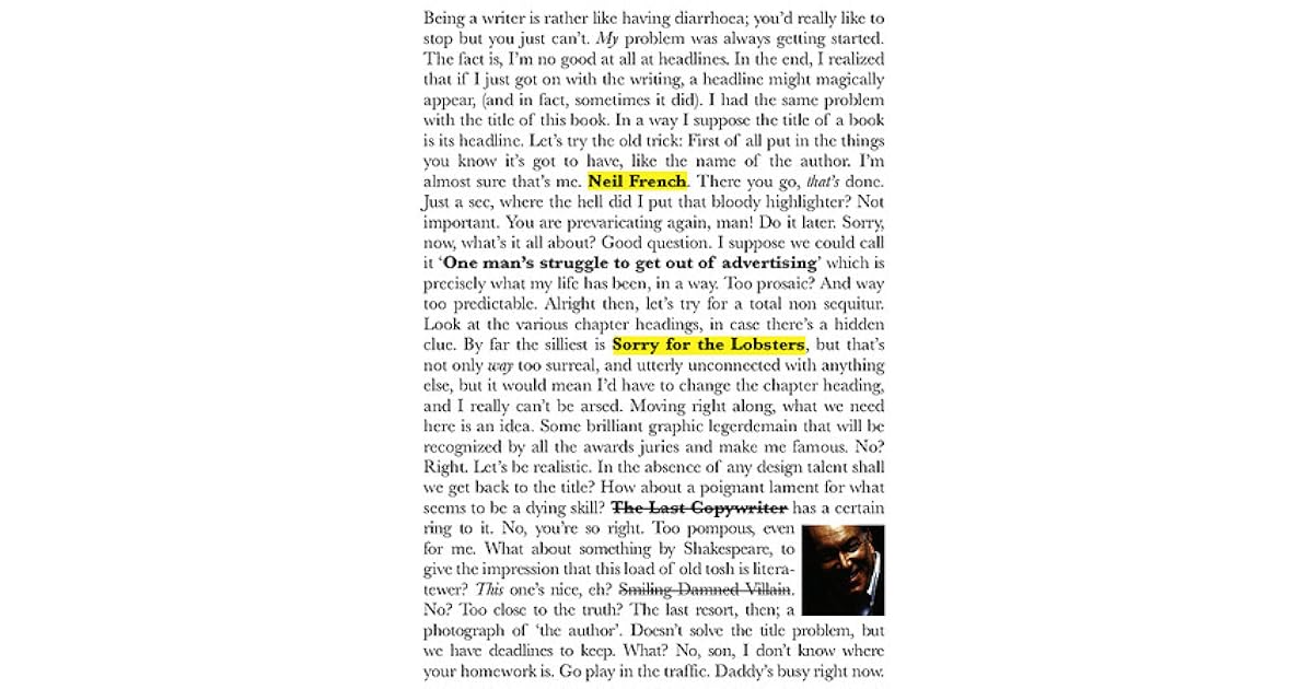 Sorry For The Lobsters Tim Isaac Reviews Neil French S Memoirs News Campaign Asia - When french enquired, he was told by one waiter after another, i have to tell your sir… i am sorry for the lobsters. thinking that it could be a religious thing (no pork, no beef, no lobsters?), french finally demanded to go into the kitchen so he could chop the lobsters up himself.
